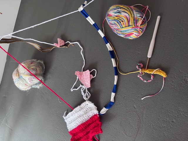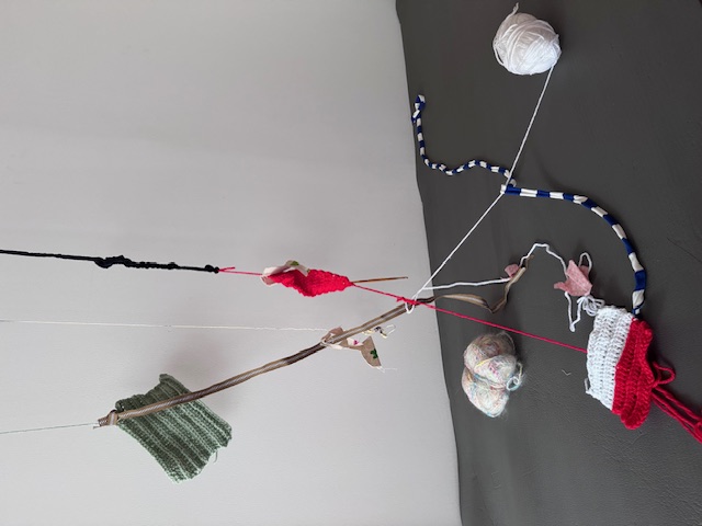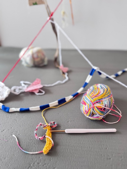 編み物をした作品をつなげても良し。その場でつないでいくも良し、自由に糸をつないで1つの作品として、作り続ける『つなぐ』が